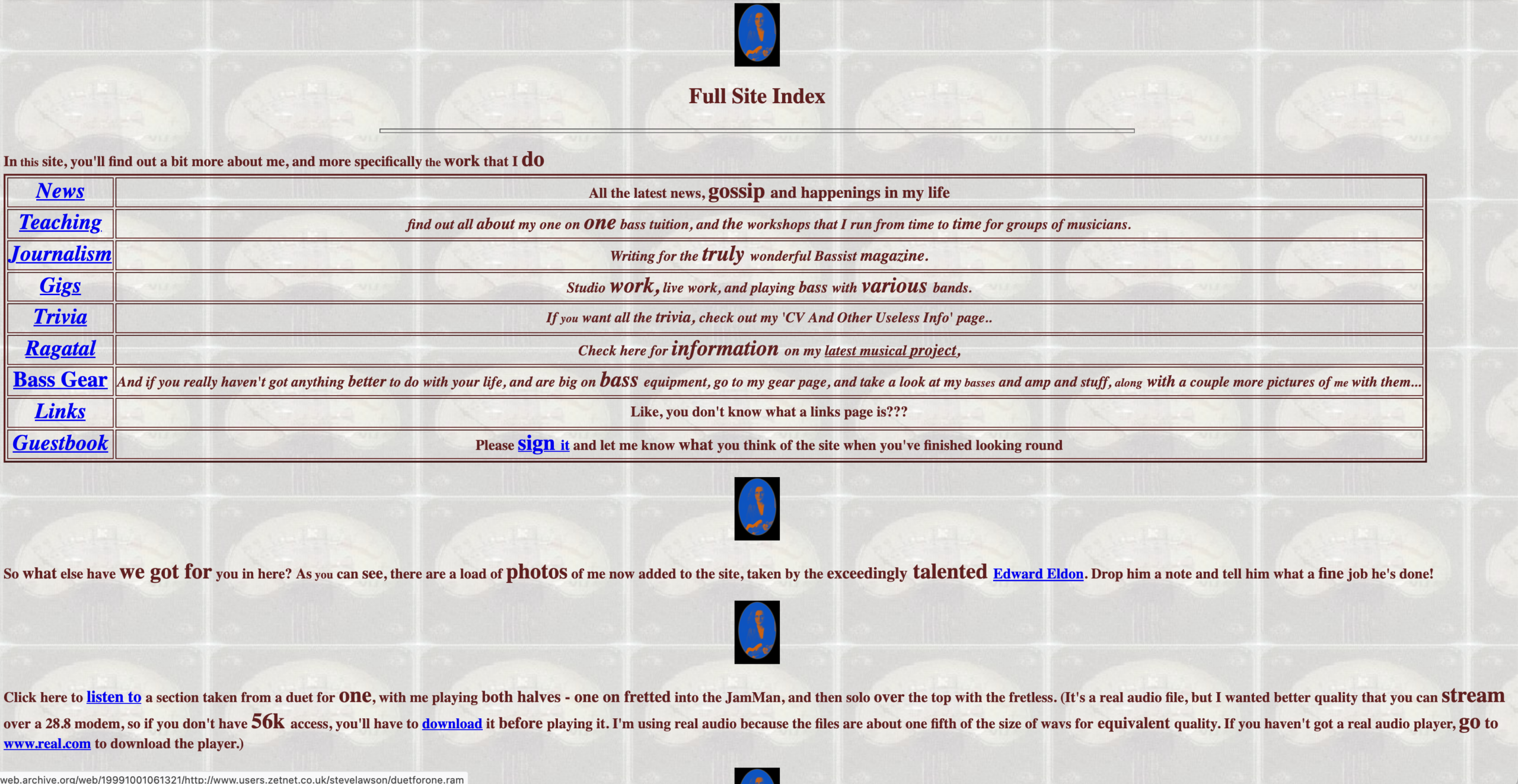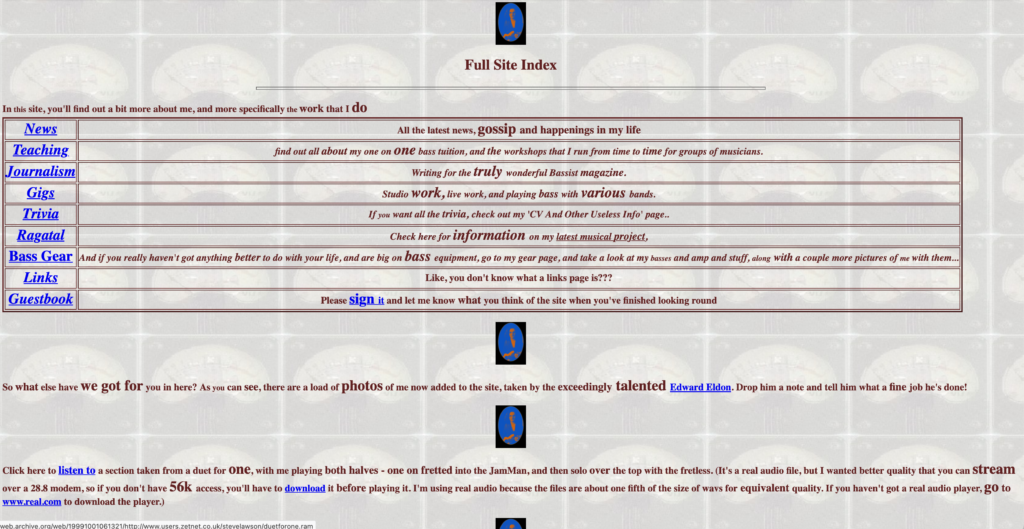 Back in 1998, being a bass player and bass teacher with a website was a vanishingly rare thing. I didn’t own a ‘proper’ URL for another year or so, but using the free space that came with my email account and some HTML skills learned from pre-Google websearching (probably on Altavista), I built a shop window for everything I was involved in at the time: